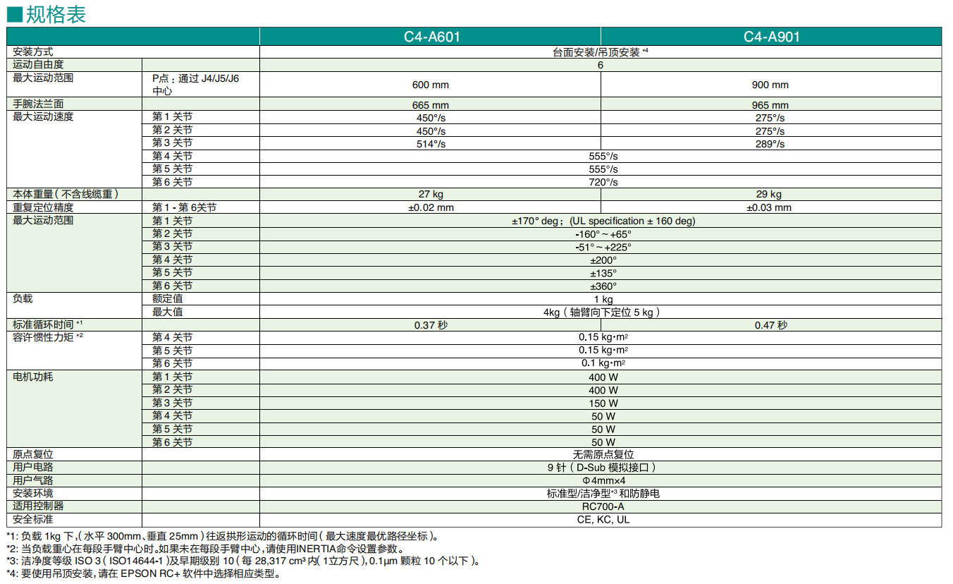 Epson ProSix C4 工作范圍600mm,有效載荷 4kg(手腕垂直向下時可以到5kg),動力保持平穩。通過新開發的愛普生傳感技術實現振動控制。新的Epson ProSix C4L的工作范圍達到900mm,但由于機械手設計得非常細長,因而僅需要極少的空間,因此,在空間的充分利用這個方面,其是同類產品所無法比擬的!